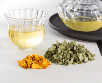 笹の葉の緑に黄金色の花びらが心なごむお茶です。